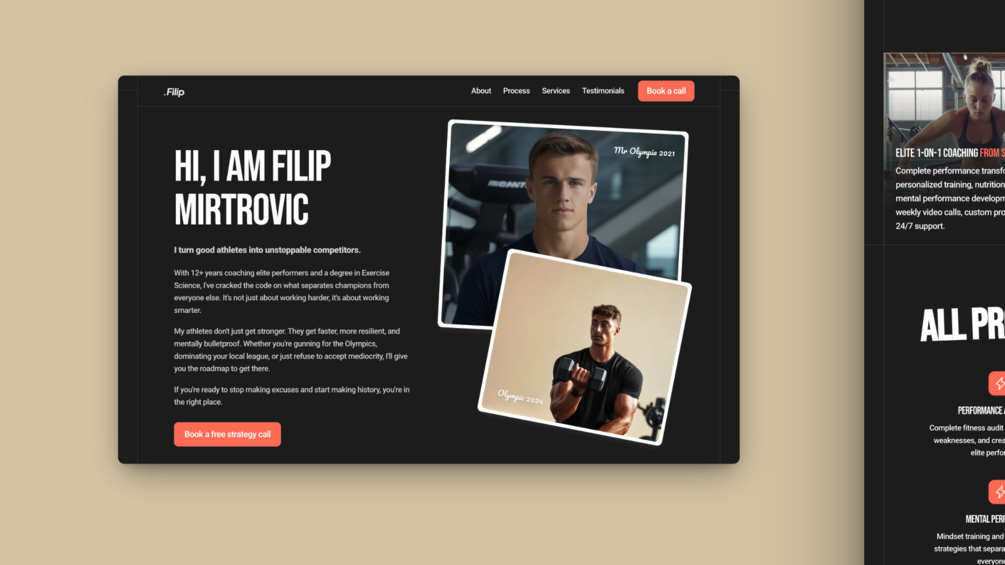 Filip is a modern and bold template designed for fitness, performance and sports coaches looking for a website that converts and shows of their style and quality. Convert leads into paying clients faster with the Filip template.